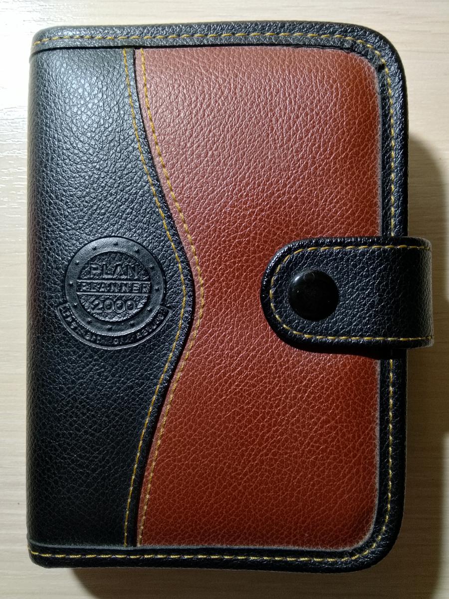 Кожаный органайзер-ежедневник Franklin Covey (или Franklin Planner) в двухцветном исполнении (черный + коричневый). Винтажная модель с застежкой на кнопку и контрастной желтой строчкой. Внутри находится кольцевой механизм для вставки сменных блоков.